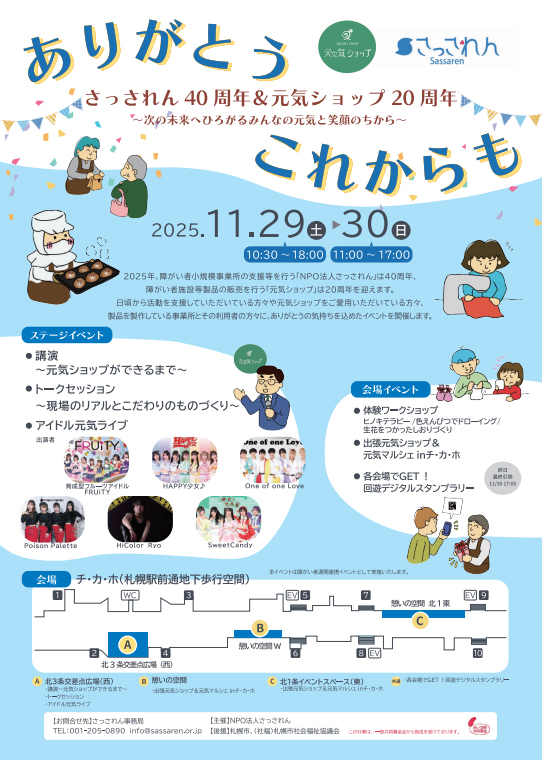 2025年、障がい小規模事業所の支援等を行う「NPO法人さっされん」は40周年、障がい者施設等製品の販売を行う「元気ショップ」は20周年を迎えます。日頃から活動を支援していただいている方々や元気ショップをご愛用いただいている方々、製品を製作している事業所とその利用者の方々に、ありがとうの気持ちを込めたイベントを開催します。